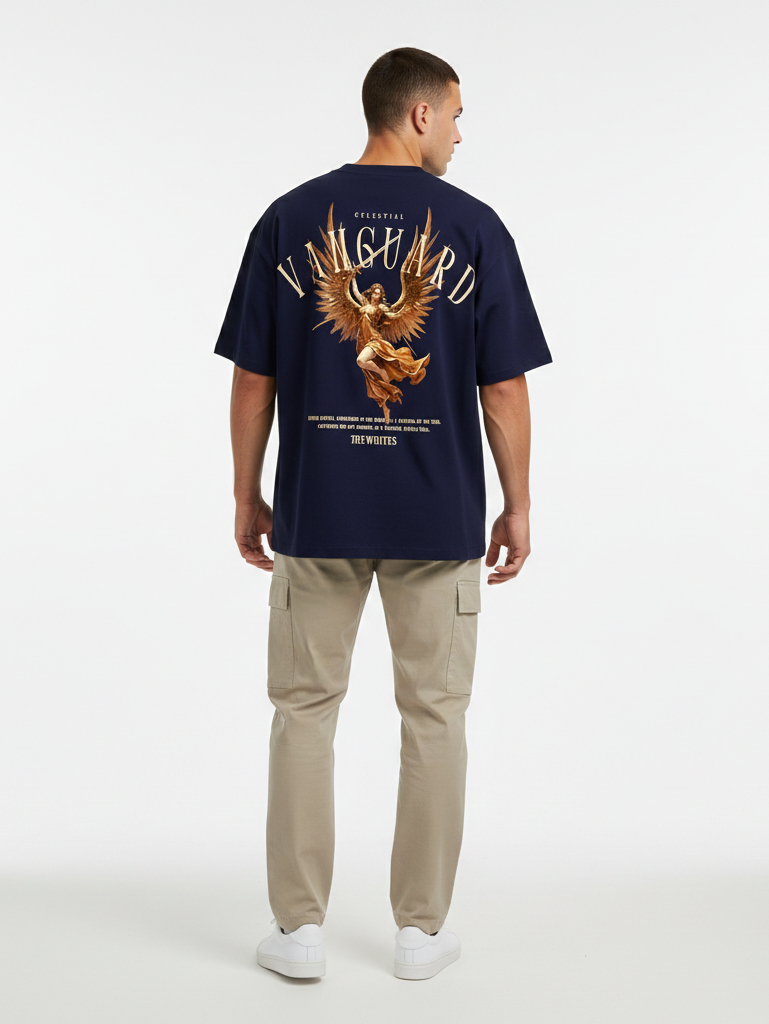 The front features a minimal “Celestial Vanguard” arch print for a refined aesthetic, while the back showcases a striking angel artwork — symbolizing strength, protection, and leadership. It’s not just a graphic; it’s a statement.